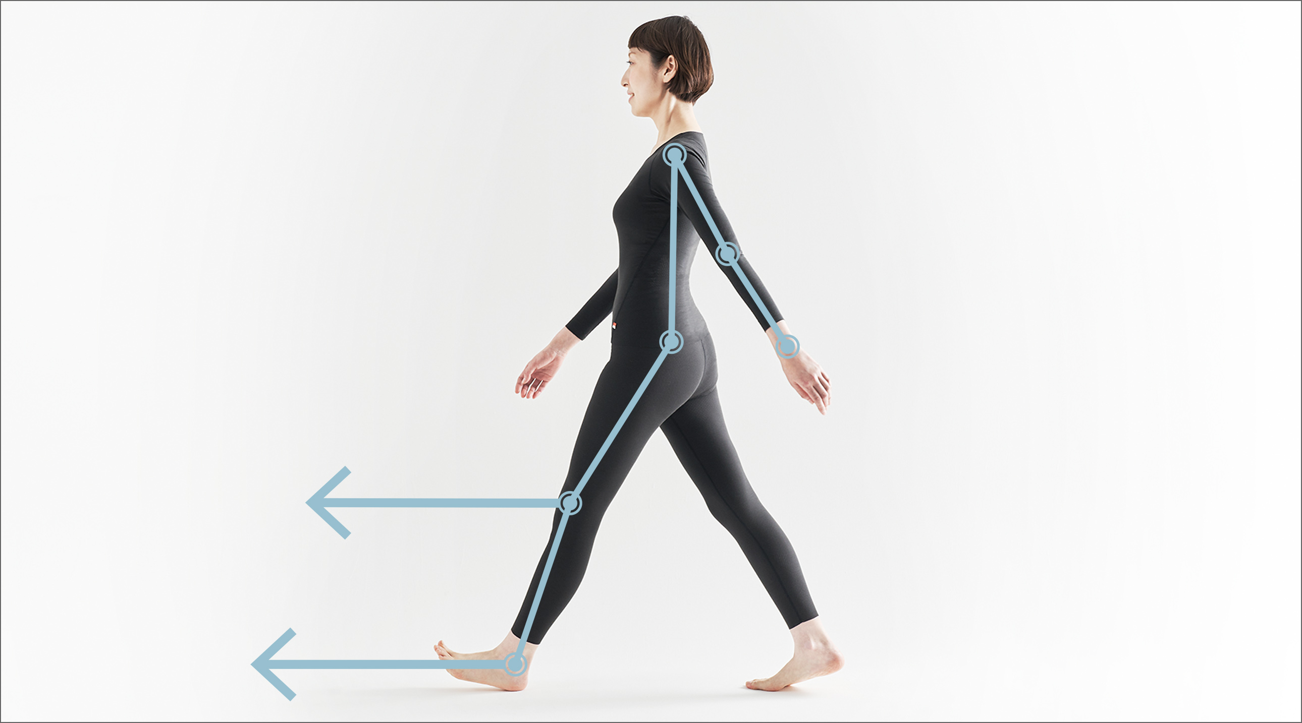 背筋を伸ばし、上腕を振り背骨まで動かすイメージで、膝を高く上げ 歩幅は大きめに歩きます。着用時、膝が正しい方向に向き、上がり やすく、上半身と下半身の連動が感じられます。日常の上手な歩き方が 健やかな身体をつくります。