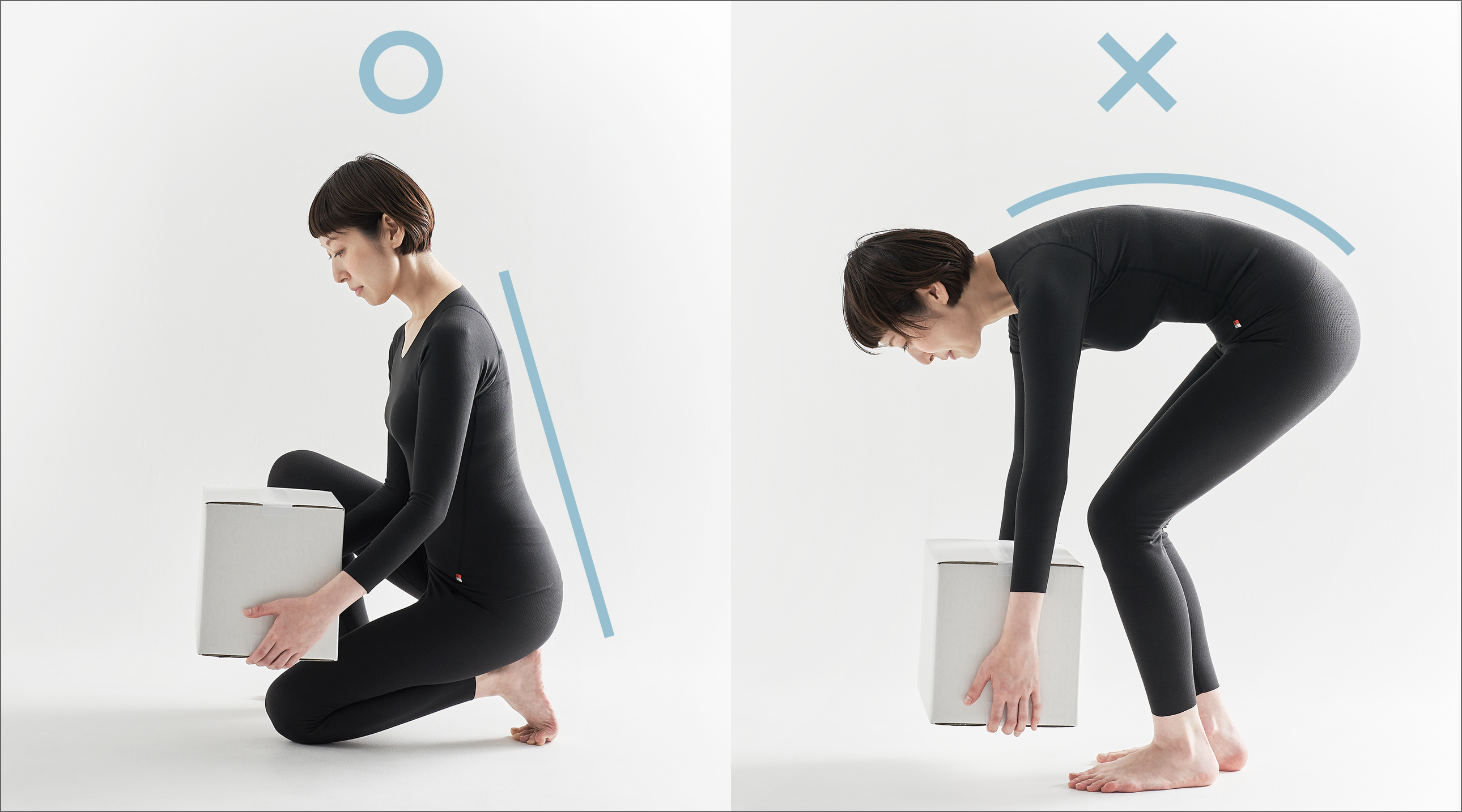膝を曲げてしゃがみ、背筋を伸ばし、股関節から下半身全体を使って 持ち上げると腰を痛めにくくなります。リーディングラインにより、 骨盤周りの安定と膝屈伸のサポートが感じられます。